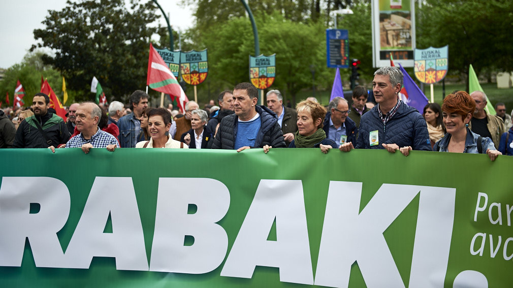 El líder de EH Bildu ha intervenido este domingo en un acto político en Pamplona, al finalizar la manifestación que la coalición ha convocado en la capital navarra por el Aberri Eguna (día de la patria vasca). Un acto que ha contado también con la participación de la candidata navarra al Congreso por la formación abertzale, Isabel Pozueta, los representantes de ERC Jordi Solé y Marta Vilalta, que ha leído una carta de Oriol Junqueras; así como Rubén Cela, de BNG.