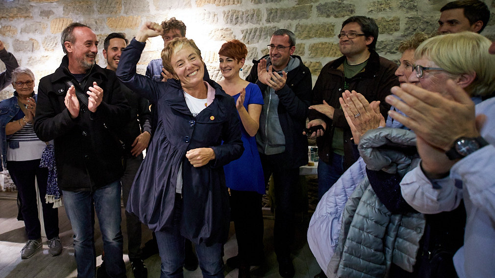Poco antes de la medianoche ha llegado a este local entre aplausos, aunque con signos de tristeza, la candidata al Congreso acompañada por Arturo Goldaracena, candidato de Cambio-Aldaketa