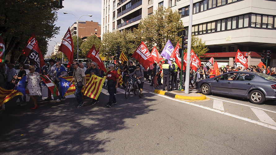 Los sindicatos abertzales ELA, LAB, ESK, Steilas, Etxalde e Hiru se han concentrado este jueves frente a la Delegación del Gobierno en Navarra para expresar su apoyo al referéndum del 1 de octubre en Cataluña y su solidaridad con la ciudadanía catalana.