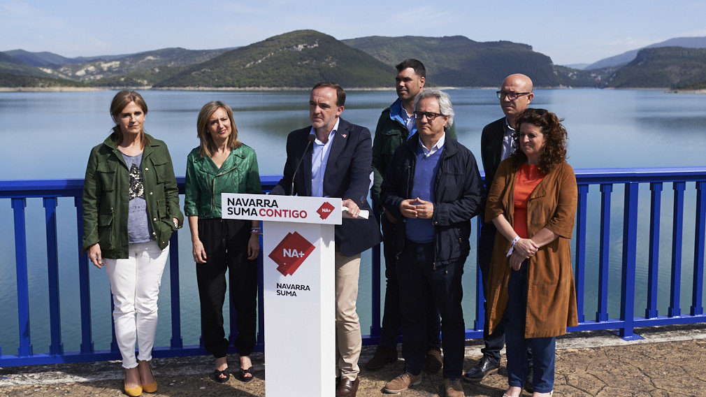 Javier Esparza ofrece una rueda de prensa en el pantano de Itoiz acompañados por algunos de sus candidatos en la lista de Navarra Suma. PABLO LASAOSA