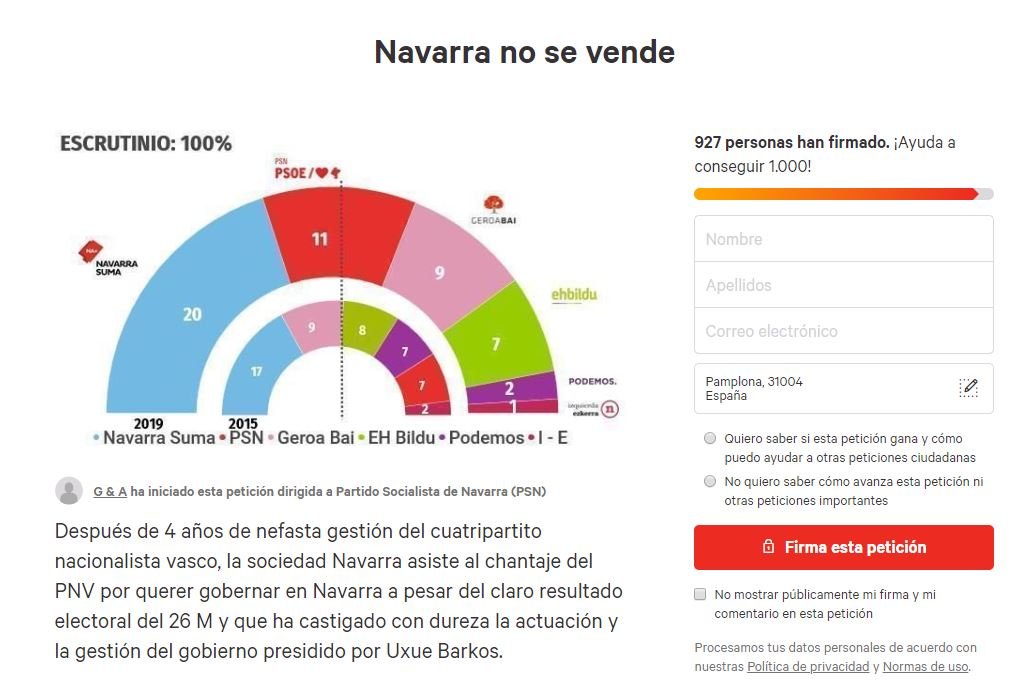 En concreto, una conocida plataforma de recogida de firmas ha recabado cerca de 1.000 apoyos para exigir al partido que lidera la socialista María Chivite que "no venda a Navarra".