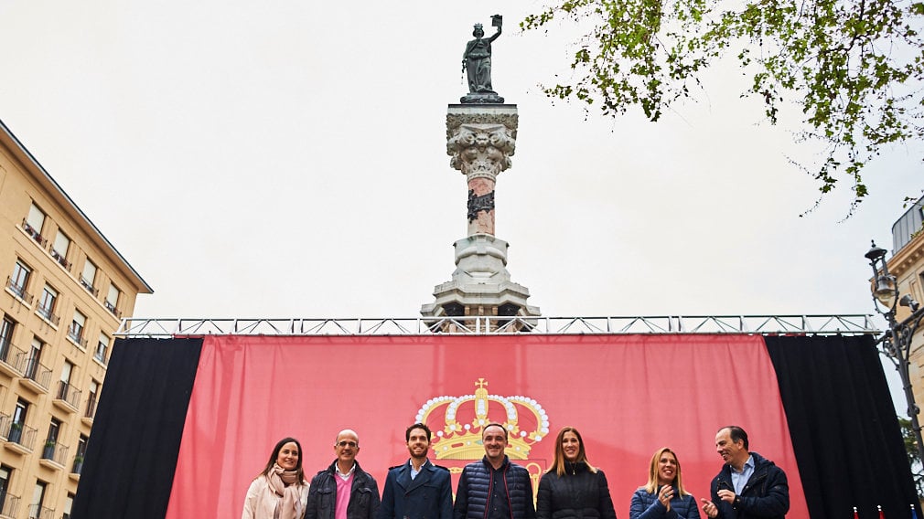 En un acto electoral de Navarra Suma, celebrado ante el Monumento a los Fueros del paseo Sarasate de Pamplona y detrás de una gran bandera de Navarra, Esparza ha criticado que "año tras año, nuestra comunidad es insultada, es vejada y es humillada" con motivo del Aberri Eguna.