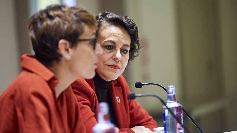 La ministra de Trabajo, Magdalena Valerio, escucha a la secretaria ganeral del PSN, María Chivite. MIGUEL OSÉS