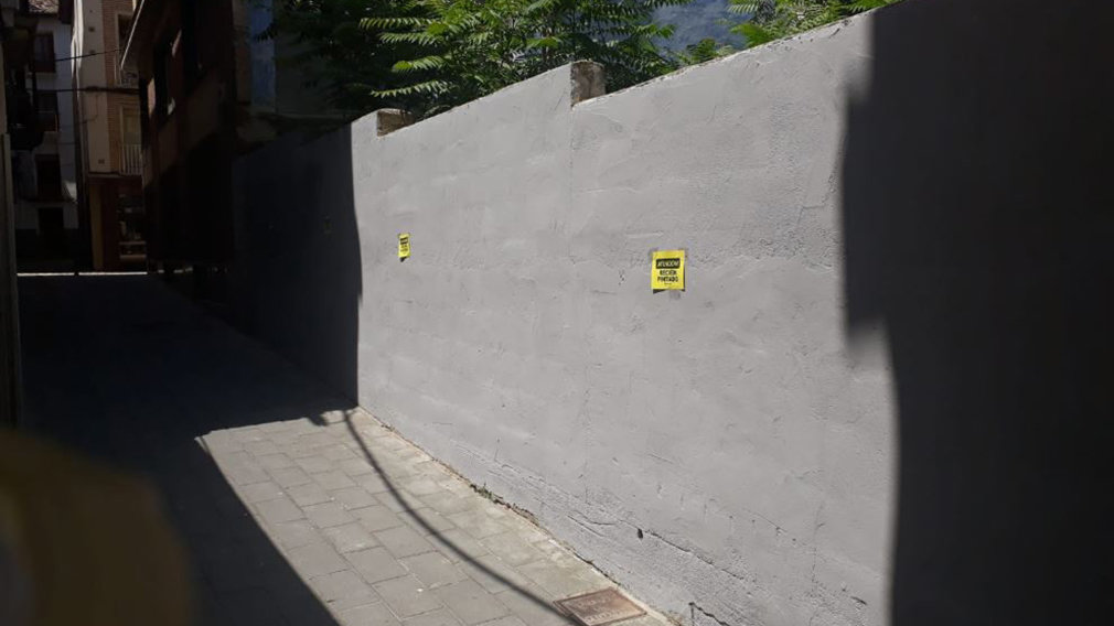 Muro de la calle San Julián de Tudela, con los carteles de "recién pintado" tras el borrado de las pintadas. CEDIDA