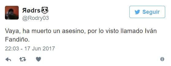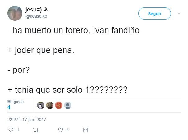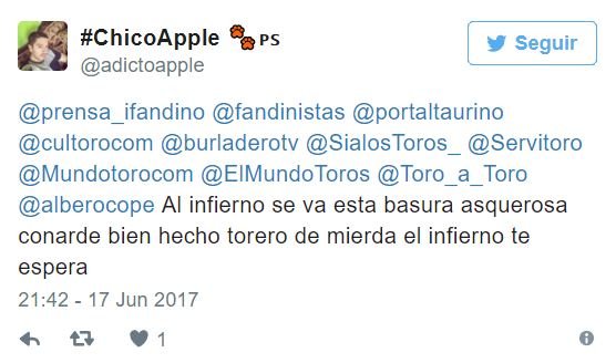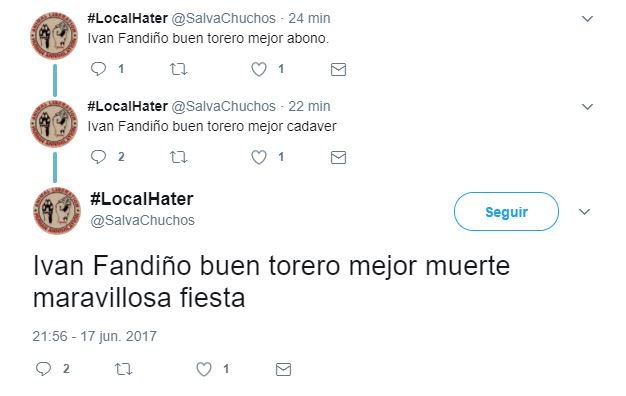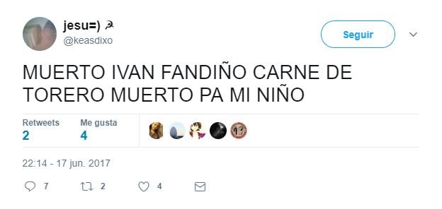 Tan sólo unos minutos después de que se confirmasen los peores presagios con la muerte del torero Iván Fandiño, tras corneado en una plaza francesa, varios desalmados usuarios de Twitter ya mostraban su alegría y burlas respecto al trágico fallecimiento.
