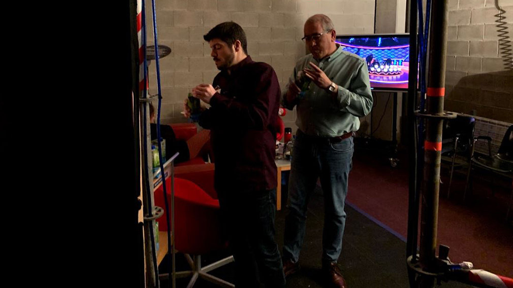 En ese lugar, junto a botellas de agua para los miembros de los dos equipos, aguarda un retén de maquilladores y personal de limpieza, necesario cada vez que explota una de las bombas de la parte inicial del programa. El regidor da el primer grito de la mañana y todo arranca: los nervios están a flor de piel y el público espera ansioso a que Los Lobos se coloquen tras sus atriles.