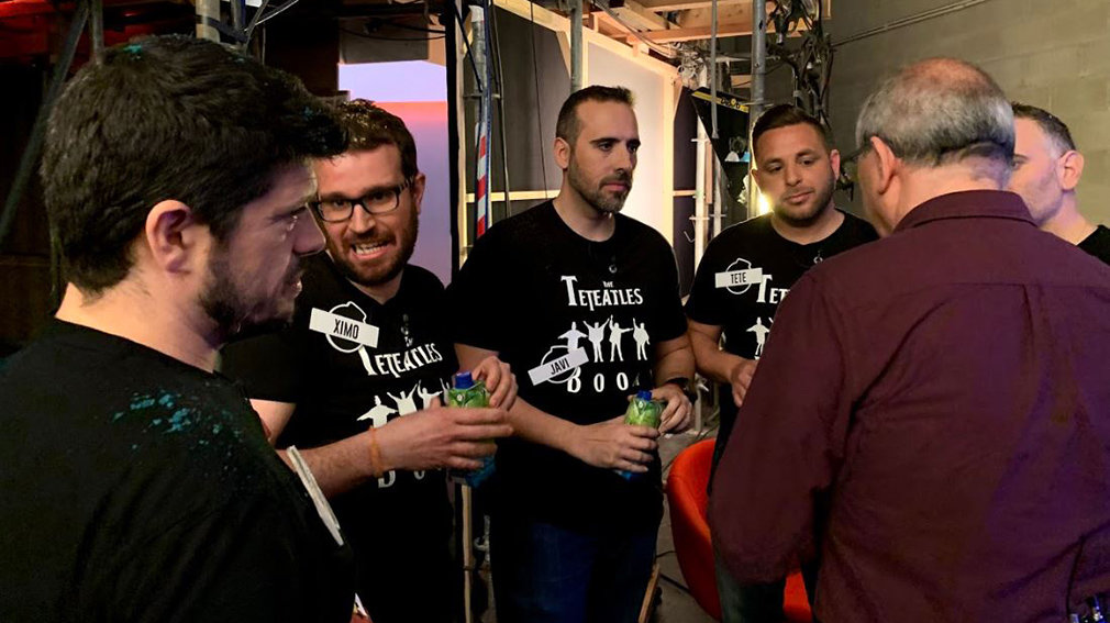 Erundino, Valentín, Manu y Alberto se han reunido al pie de las escaleras. Se dan ánimos los unos a los otros como los jugadores de un partido de fútbol que aguardan en el túnel de vestuarios. Su entrada no está tan programada como la de sus rivales, ya que, cuando comienza el programa, ellos ya están colocados en el plató, al contrario que el otro equipo, que accede desde el corralillo.