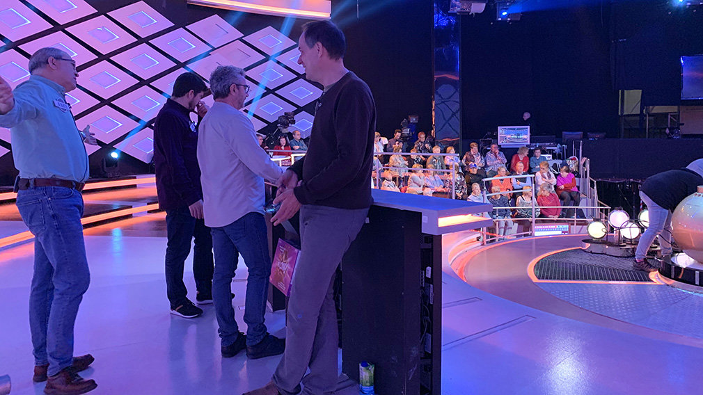Una vez finalizadas las explicaciones, el presentador accede al plató y da inicio a la grabación del primer programa de ¡Boom! del día. El equipo técnico, comandado por las directrices del regidor, actúa rápido, haciendo valer la experiencia acumulada tras cientos de concursos realizados. En el monitor del corralillo no se perciben diferencias con lo que después se ve en el televisor, ya que la fluidez protagoniza el ritmo con el que Bonet dirige las presentaciones de los concursantes y subraya los datos que acompañan a Los Lobos: 436 programas, 2.208.100 euros ganados y 3.785.000 euros que les esperan en el bote, si eliminan antes a sus nuevos contrincantes. Aplausos y ovaciones, y, enseguida, las primeras preguntas.