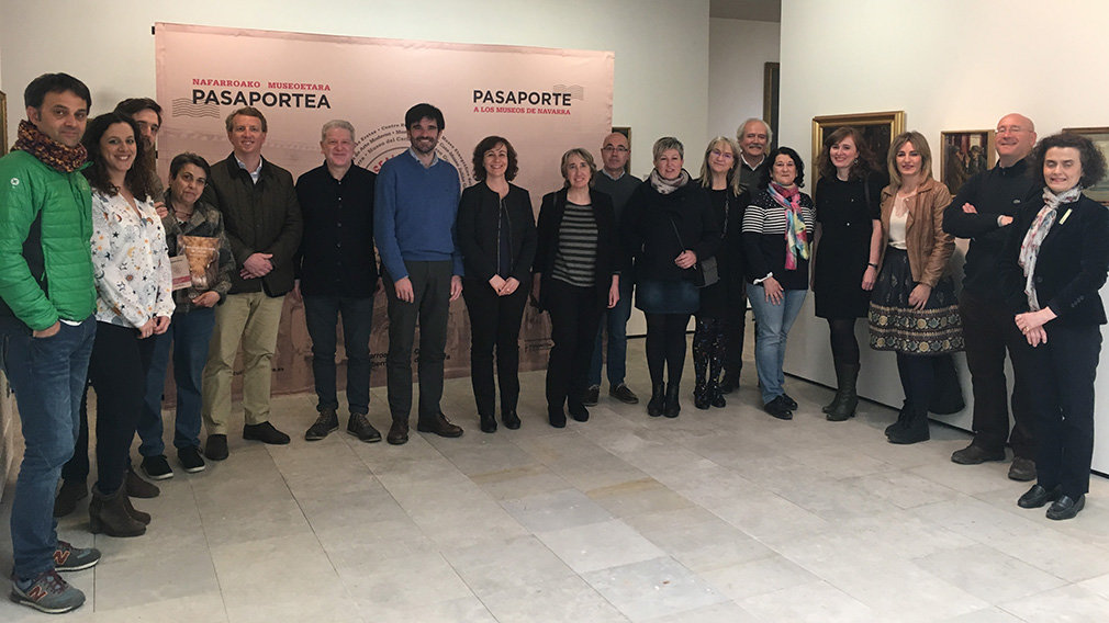La consejera de Cultura Ana Herrera y el alcalde de Tudela, Eneko Larrarte, posan con responsables de museos de Navarra ante su campaña de promoción. GOBIERNO DE NAVARRA