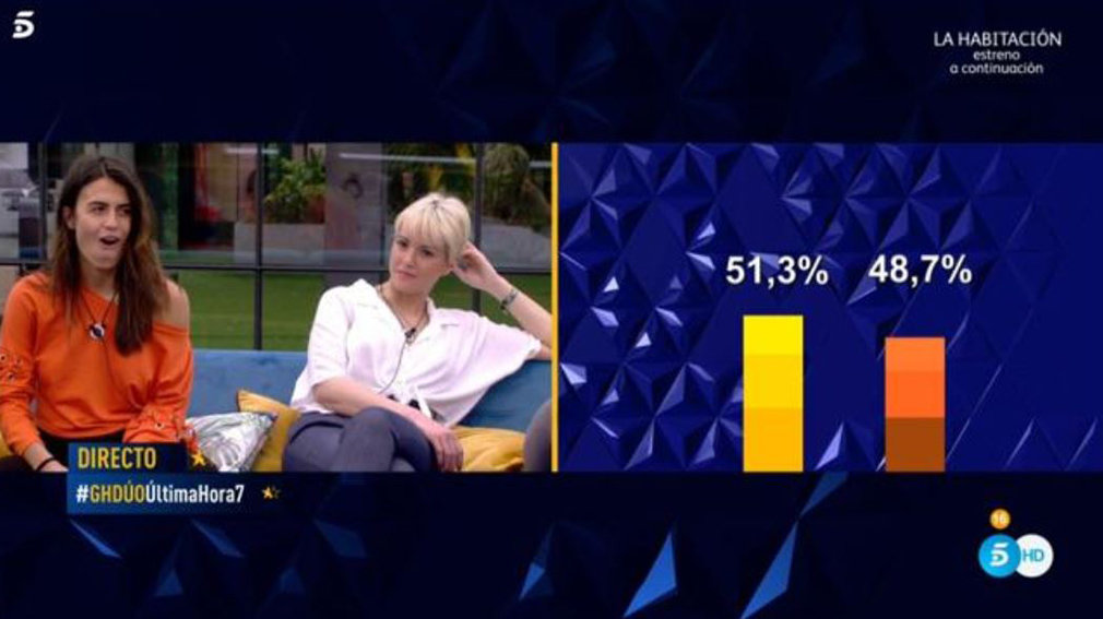 A pesar de que la concursante pamplonesa daba por hecho que será la próxima eliminada, los porcentajes se encuentran muy ajustados con un 51,3% frente a un 48,7%. Las dos grandes rivales, que ya se batieron en duelo en 'Supervivientes', resolverán su última lucha en la próxima gala.