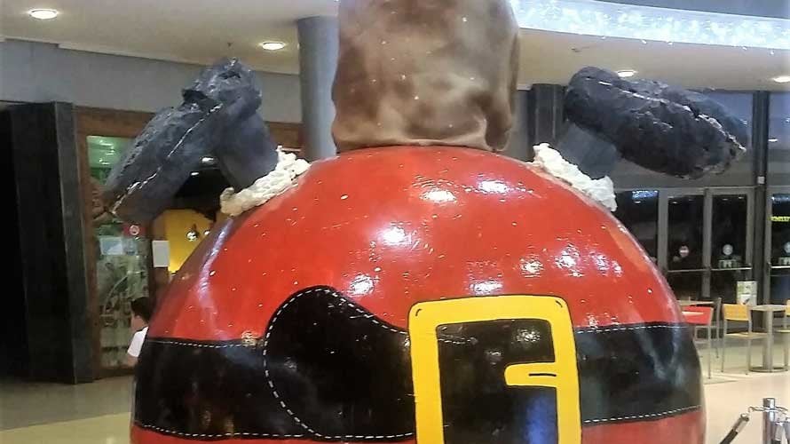 En esta esfera se ha recreado una divertida escena, la de Papá Noel atascado en la chimenea. Se ha usado poliespan, cartón, espuma de poliuretano y pintura.