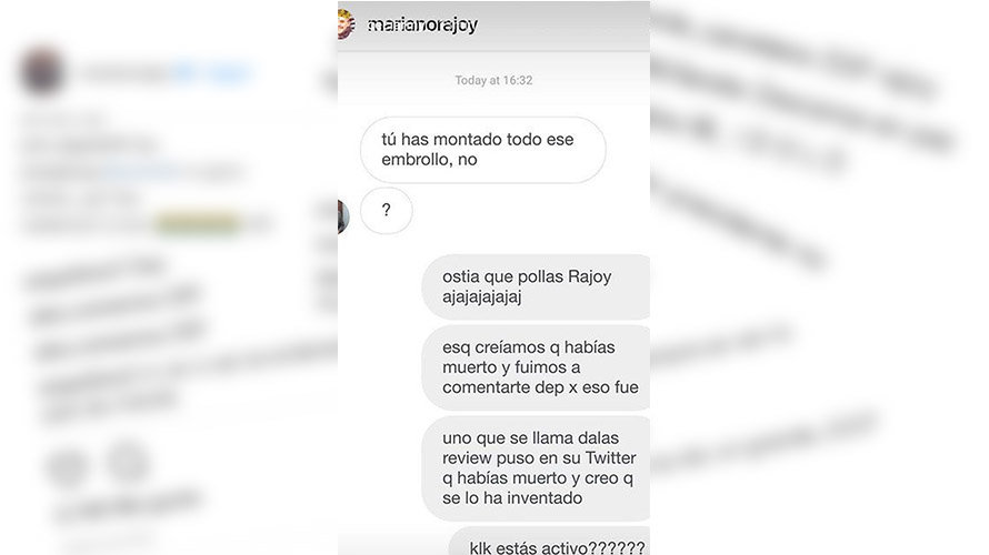 "Ostia que pollas Rajoy ajajajajaj", "esq creíamos q habías muerto y fuimos a comentarte dep x eso fue" y "uno que se llama dalas review puso en su Twitter q habias muerto y creo q se lo ha inventado" son algunos de los mensajes con los que ha respondido Reydearmada a Rajoy y que ha hecho públicos.