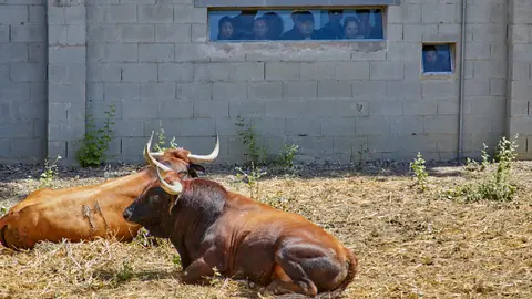 Los móviles y curiosos se asomaban por las ventanas para ver los toros en los corrales, a los que llegarán otras ganaderías a lo largo de estos días, como los veloces Jandilla o Victoriano del Río, participantes el 12 y 13 de julio respectivamente.
