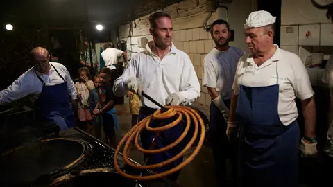 En torno a los fogones se reúnen jardineros, abogados, profesores que, por unos días, se ponen el delantal y cambian sus gremios por la tradición que arrastran. "Esta noche no he dormido prácticamente nada. Al final son 150 años que llevamos haciendo todo de la misma forma, pero siempre hay una pequeña tensión de que todo esté en orden", reconoce Elizalde.