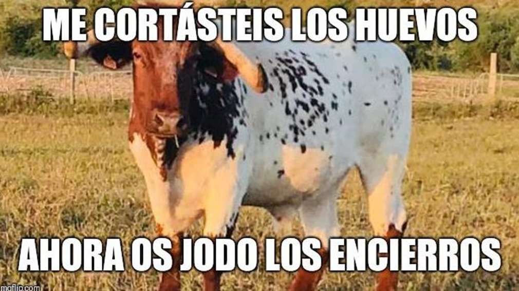 También hay fotografías con mensajes hilarantes referidas a estos animales del encierro, tan importantes para aumentar la seguridad del acto pero que este año no están convenciendo, debido a su gran rapidez. "Me cortasteis los huevos, ahora os jodo los encierros", se lee en uno de esos memes.