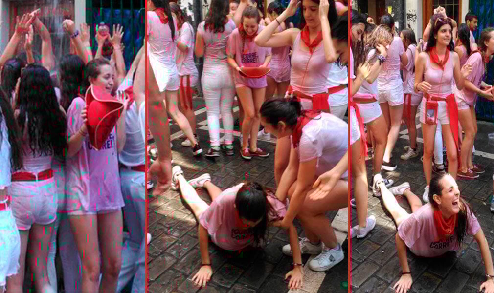 Una joven ha sufrido en sus primeras carnes un 'resbalón' por apresurarse a meterse en uno de los chapuzones vertidos desde los balcones. Por fortuna, en Sanfermines no hay dolor, como suele decirse en estos casos.
