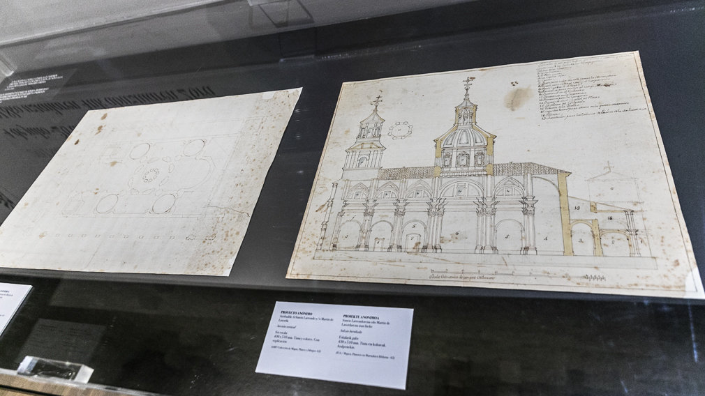 Los tres siguientes exhibidores recogen una cuestión poco conocida por el gran público. Las desavenencias sobre la forma de ejercicio del patronazgo entre los munícipes y la Obrería de la parroquia llegó hasta el punto de llevar al Consistorio a plantearse erigir su propia capilla e, incluso, a gestionar los permisos para construirla junto a la huerta de su Casa de Misericordia, ubicada en el actual Paseo de Sarasate, entre los edificios del Banco de España y Correos.