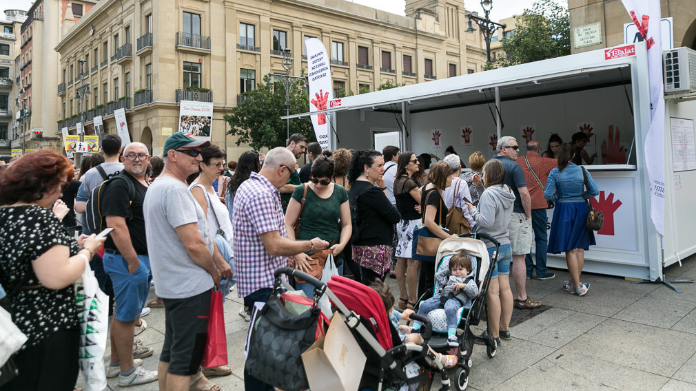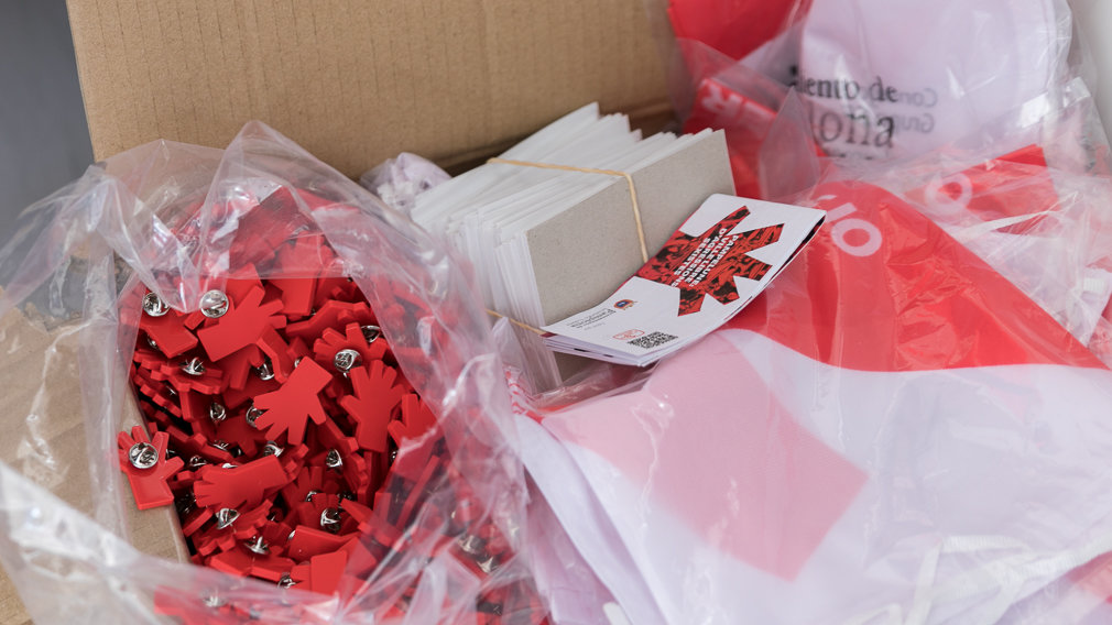 La difusión de la campaña se completa con pegatinas, servilletas, carteles, velas de señalización, lonas en los laterales de los escenarios o mupis; con el reparto y la puesta a disposición de la ciudadanía de 26.000 pins de manos rojas; con la edición de 22.000 guías en cuatro idiomas sobre ‘Cómo identificar la violencia sexista, cómo frenarla, responder o buscar ayuda y atención’; con anuncios en prensa, cuñas de radio y con el reflejo de la campaña en la app oficial de San Fermín y en el programa de fiestas.