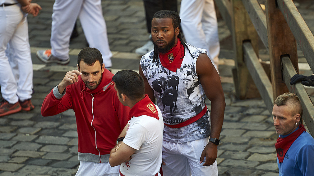 El jugador de fútbol americano, Josh Norman, en el recorrido del encierro momentos antes de que saliesen los toros de Victoriano del Río.MIGUEL OSÉS