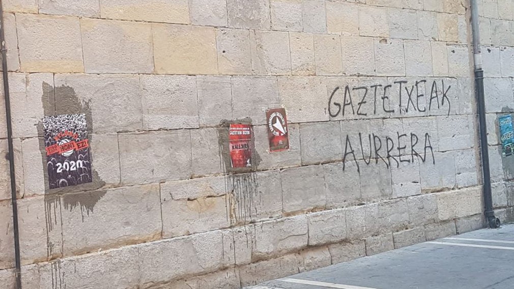 Así, en una de las fachadas laterales de la iglesia pamplonesa se han escrito mensajes como "presoak etxera", "guiris go home!" o "gaztetxeak aurrera", junto a carteles pegados de colectivos del Casco Viejo de la ciudad.