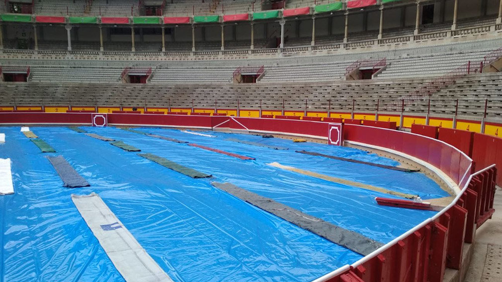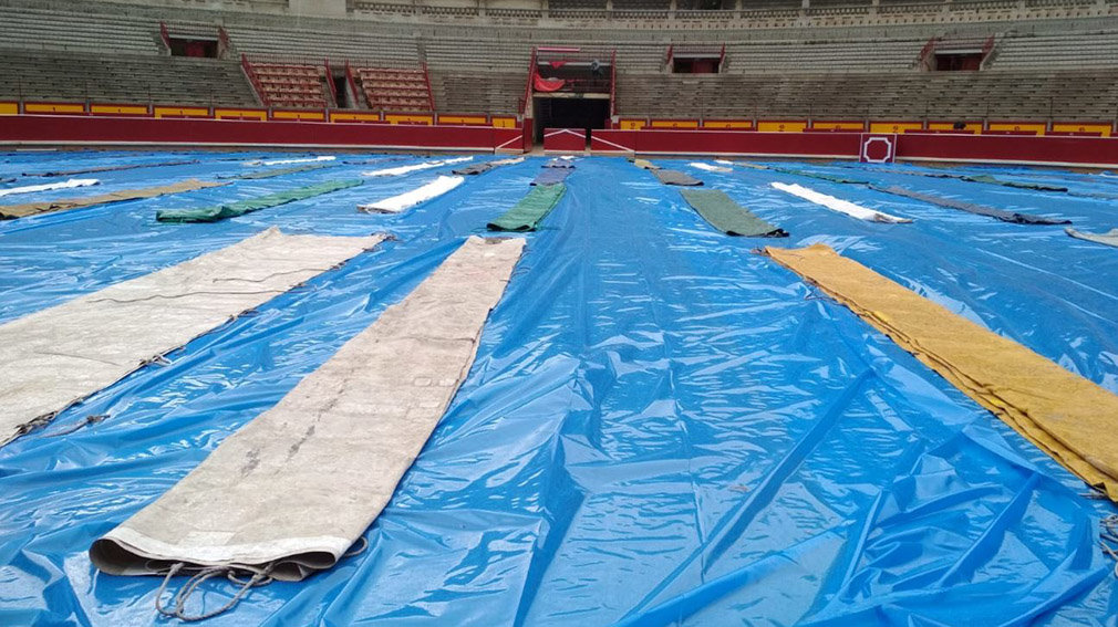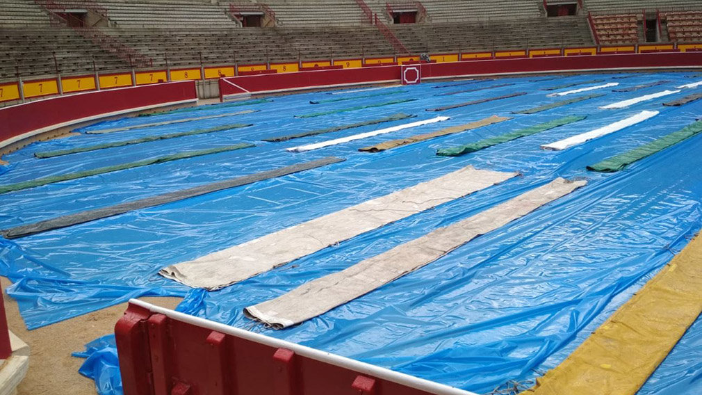 Desde la Casa de Misericordia, en previsión de la tormenta, se ha dado orden a los operarios del coso para cubrir con lonas todo el ruedo y tratar de proteger la arena de las fuertes trombas.