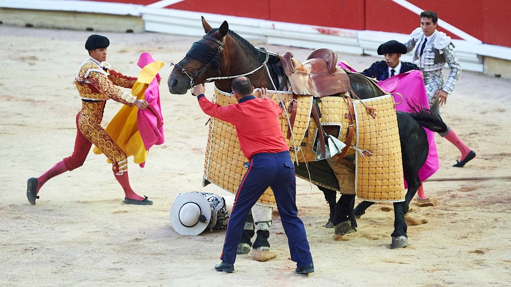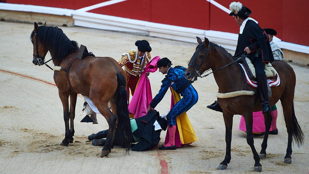 El paseíllo de la novillada que da inicio a los festejos en la plaza de toros de Pamplona ha estado marcado por la caída de uno de los alguacilillos después de que su caballo se encabritase en la clásica vuelta al ruedo que realizan los dos jinetes. Unos minutos después, un picador ha terminado en la arena tras la embestida de uno de los astados.