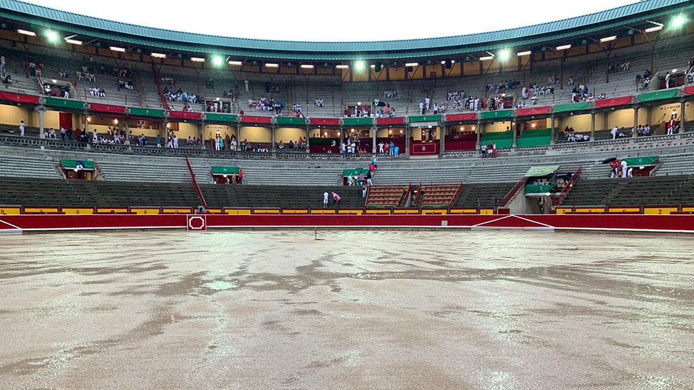 La tromba de agua que ha comenzado a caer en la capital navarra en torno a las 17 horas ha anegado completamente el ruedo de la Plaza de Toros, haciendo imposible el desarrollo de la lidia a la hora previsa.