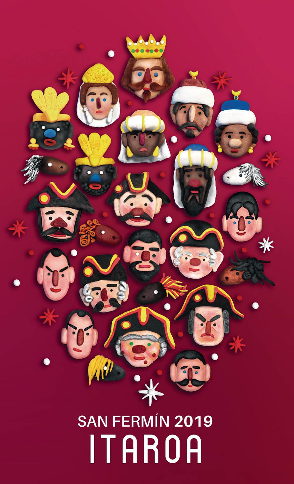 El diseño de 'Leyendas' es una composición elaborada a partir de 25 figuras de arcilla polimérica realizadas por el propio autor, que representan a la centenaria Comparsa de Gigantes y Cabezudos de Pamplona.