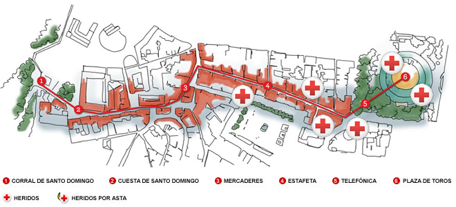 Los cabestros han tomado la delantera desde el primer momento con 4 de ellos encabezando la manada desde la salida por la cuesta de Santo Domingo y han liderado el encierro hasta la calle Estafeta. Se han visto algunos derrotes en la zona de Santo Domingo sin peligro, que junto con algunas caídas han sido lo más peligroso del primer tramo.