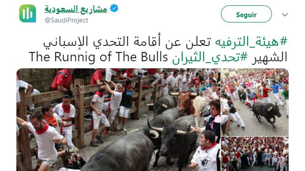 Por su parte, la cuenta oficial de Twitter de "proyectos saudíes" en la que se anuncian las diferentes iniciativas promulgadas por el reino para el entretenimiento informó de que "la autoridad del Entretenimiento anuncia la celebración del famoso 'reto de los toros' español", como denomina a los encierros.