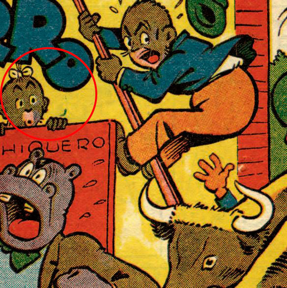No es la única imagen en la que la mujer aparece como 'víctima' de los toros. En la ilustración que acompaña a los actos del día 13 de julio, se puede apreciar a una especie de 'mona' con un lazo en la cabeza que se esconde detrás de un burladero o vallado de los feroces toros que corre un hipopótamo. Se trata de un dibujo de Emili Boix Pagès, usado para la biblioteca especial para niños.