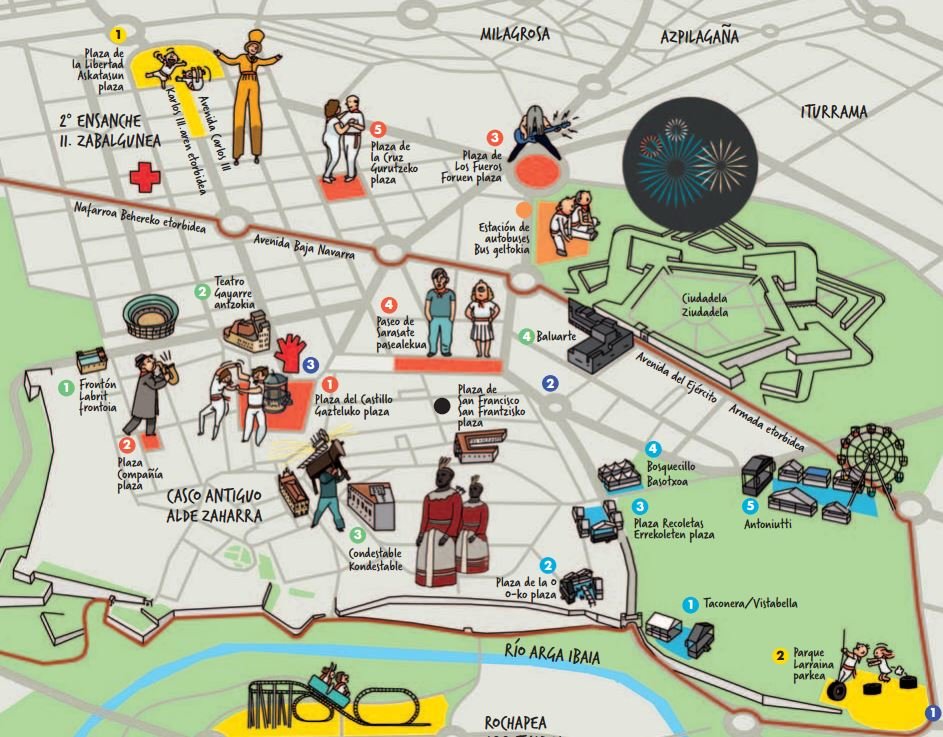 Es necesario llegar hasta las páginas finales para ver a un grupo de mujeres que bailan junto a hombres y que han servido para ilustrar algunas de las zonas de fiesta en Pamplona o determinadas actividades que se desarrollan en los nueve días de fiesta en la que Pamplona se tiñe de blanco y rojo.