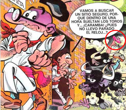 En otra ocasión, en la imagen del popular cómic de Ibáñez 'Super Mortadelo' (11 de julio) y que refleja el encierro en la calle Estafeta, la mujer se muestra a través de un solo elemento como es un zapato de tacón rosa que emerge entre la manada de toros después de ser arrollada.