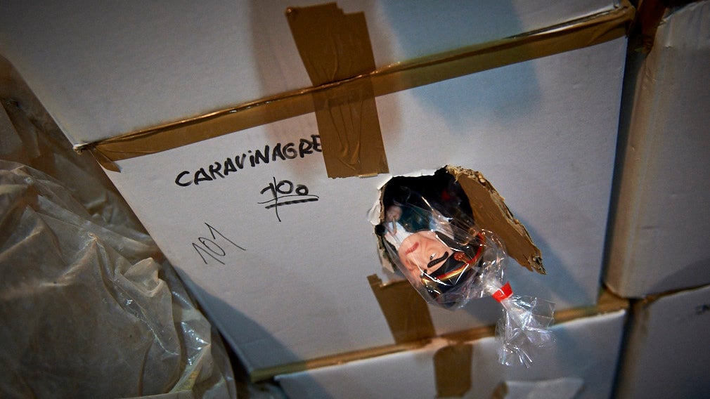 Figura de goma del cabezudo Caravinagre en el taller de Platero, en la caja listo para ser enviado a las tiendas de Pamplona. MIGUEL OSÉS