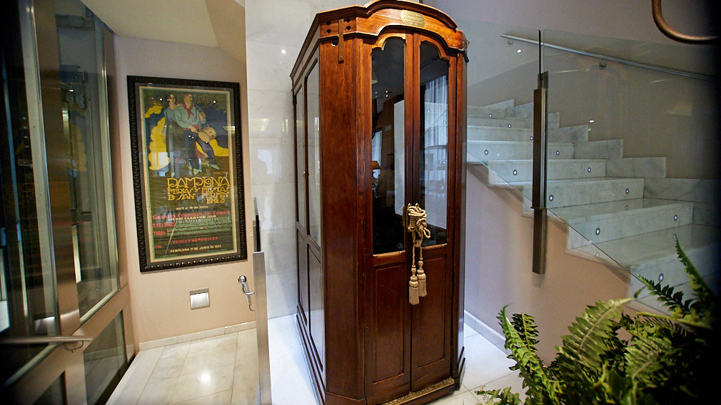 El primer ascensor que tubo el histórico hotel de la Plaza del Castillo. ALZUGARAY