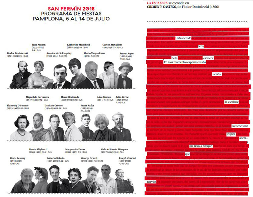 Para la maquetación del programa de fiestas de San Fermín, los editores Javier Errea (castellano) y Jon Alonso (euskera) han trabajado sobre las primeras páginas de obras de autores y creadores de la literatura universal de las que extraer su ADN sanferminero.