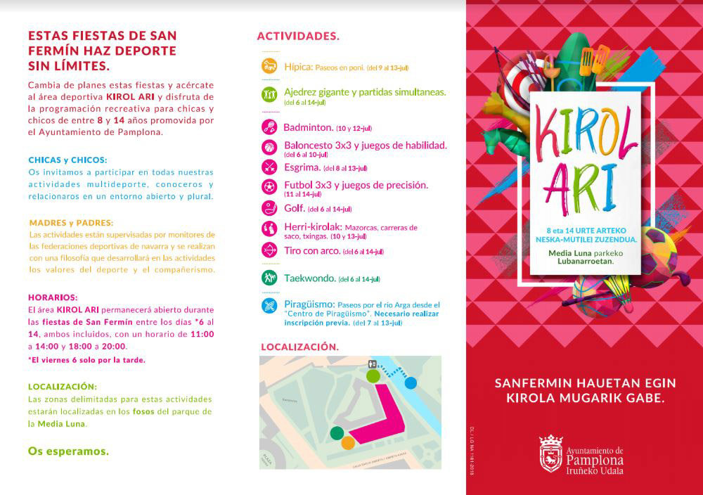 El nuevo espacio deportivo, dirigido orientativamente, a chicos y chicas entre 8 y 14 años, ofrecerá diferentes actividades que favorecerán su interactuación e interrelación, así como la difusión de valores propios del deporte como el compañerismo. Se ubicará en los fosos de la Media Luna, en el entorno del Centro de Interpretación de las Fortificaciones de Pamplona, con varias zonas en las que se desarrollará la programación prevista cada día. Todas las actividades son gratuitas, abiertas, plurales e integradoras, y estarán supervisadas por monitores de las federaciones deportivas colaboradoras.