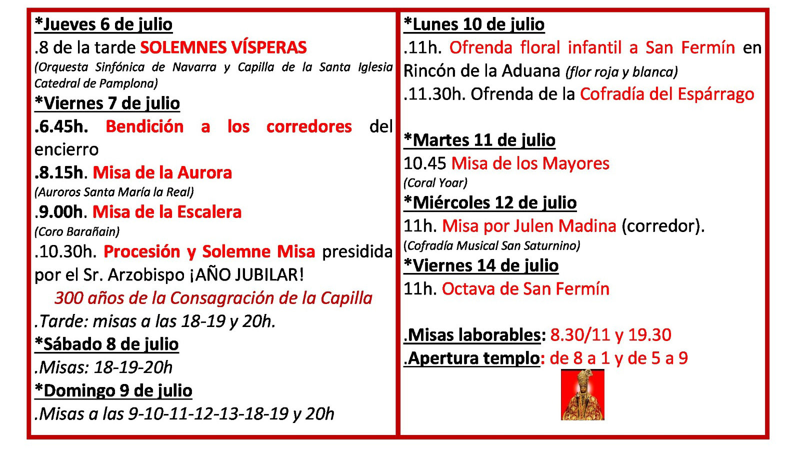 Los Sanfermines están a la vuelta de la esquina y la capilla de San Fermín ya ha confeccionado el calendario que recoge algunas de las ceremonias religiosas más esperadas por los pamploneses a lo largo de todo el año.