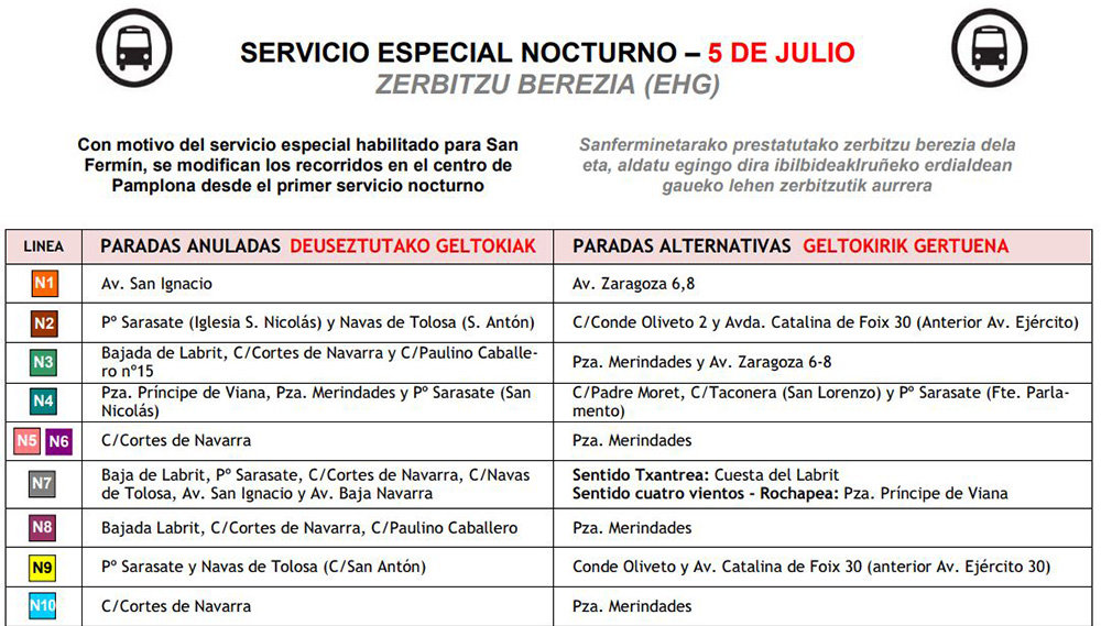 Por otra parte, como en años precedentes, del 6 al 14 de julio todas las líneas (a excepción de la L7, L19, L23, Línea A y Ferial) dispondrán de servicio las 24 horas del día de manera ininterrumpida y verán modificados sus horarios y recorridos.