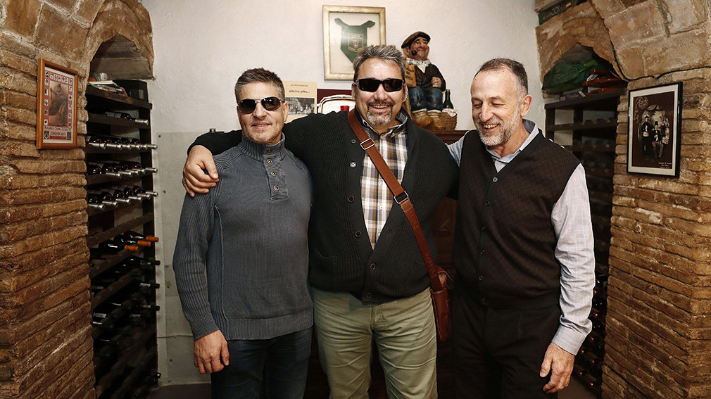 Los montañeros ciegos Serafín Zubiri (izquierda), Alfonso Fidalgo (centro) y Javier Sáinz de Murieta (derecha) posan durante una reunión que han mantenido en Pamplona para celebrar el 25º aniversario de una ascensión que hizo historia, coronar el Aconcagua. EFE/JESÚS DIGES