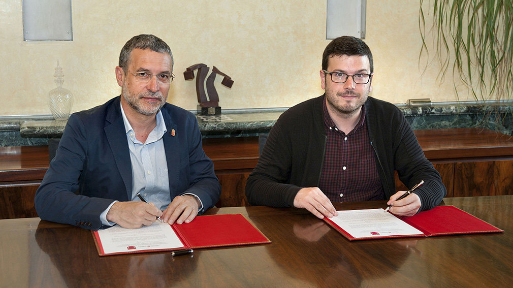 El vicepresidente Miguel Laparra y el alcalde de Aoiz, Unai Lako, firman un convenio para la incorporación del municipio en la bolsa de alquiler público. GOBIERNO DE NAVARRA