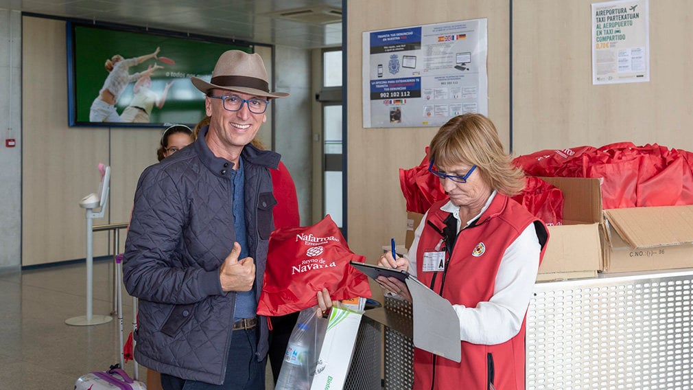 Uno de los viajeros llegados a Noáin recibe un obsequio por parte del área de Turismo del Gobierno foral. GOBIERNO DE NAVARRA