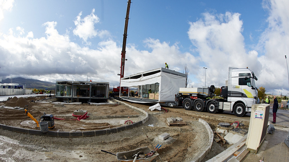 El primer módulo ha salido de la nave de Nuevo Sistema Modular en Salinas de Pamplona a las 8 horas con destino a Zizur Mayor, donde ha sido montado a las 8.30 horas. Sucesivamente, se ha ido repitiendo el proceso con el resto de los módulos hasta que se ha completado el edificio hacia las 18 horas.