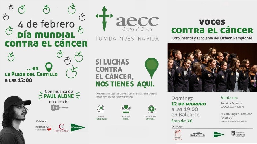 El 12 de febrero, el Coro Infantil y la Escolanía del Orfeón Pamplonés (en total más de 130 voces) actuarán en el concierto solidario “Voces contra el cáncer” en la sala principal de Baluarte en función organizada por la AECC con la colaboración del Ayuntamiento de Pamplona y el Orfeón Pamplonés. El concierto comenzará a las siete de la tarde.