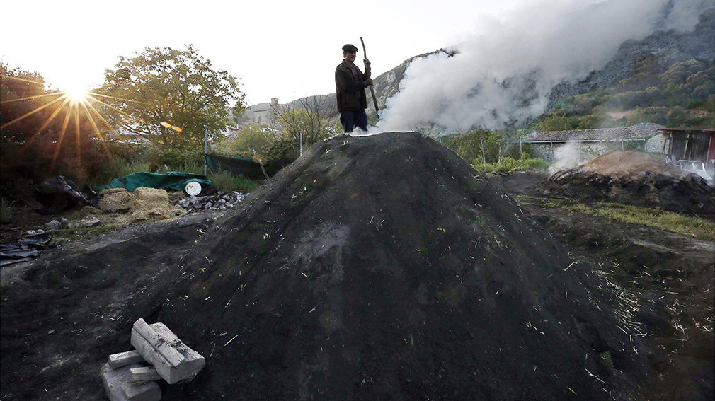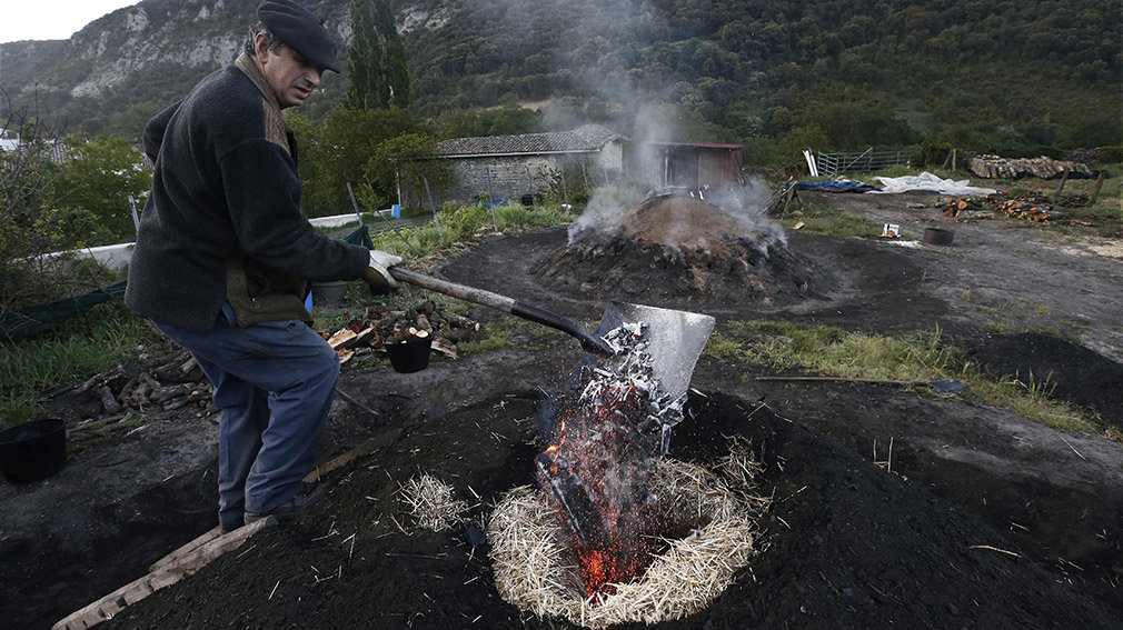 En Viloria, en la zona conocida como "las eras", todavía humean en verano las carboneras donde se produce el preciado carbón vegetal "de la misma forma en que lo hacían nuestros antepasados", explica Lander.