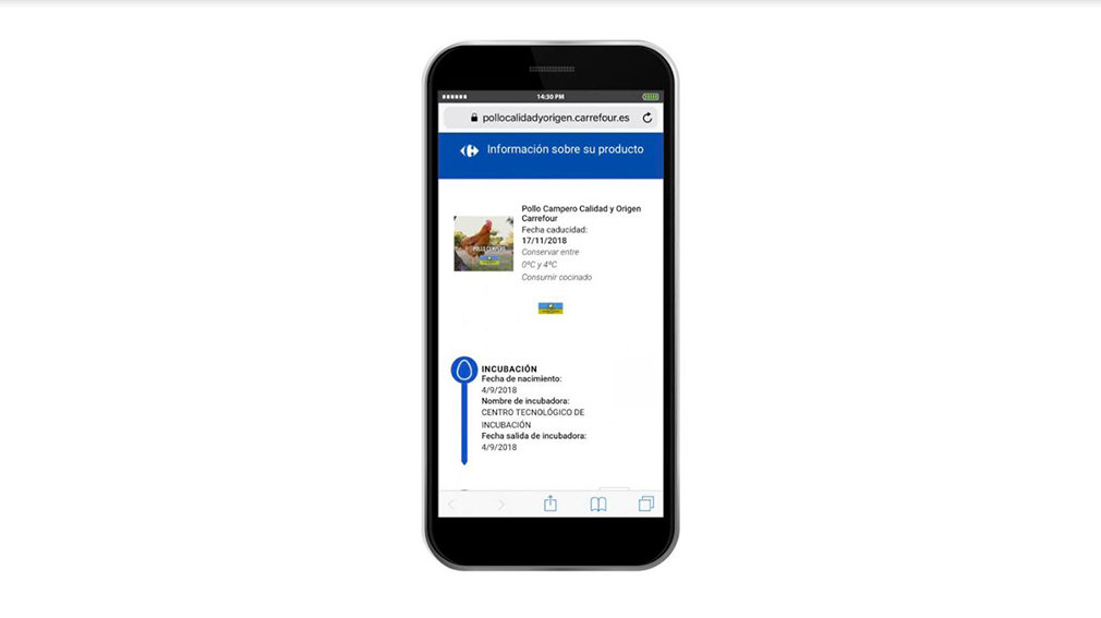 En el caso concreto del pollo campero “Calidad y Origen”, se incluye en su etiqueta un código QR, que se escanea a través del smartphone. De este modo, el consumidor navarro puede conocer información relativa a este producto, como por ejemplo, la fecha de nacimiento del pollo, el modo de cría, la ubicación de la granja, el alimento que ha recibido, el proceso de envasado o la fecha en la que ha llegado a los almacenes de Carrefour.