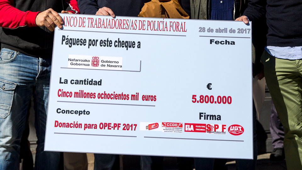 Así lo ha señalado Jiménez en declaraciones a los periodistas minutos antes de que los sindicatos hayan hecho entrega en el registro del Gobierno de Navarra de un cheque simbólico por valor de 5,8 millones de euros, "la diferencia" entre lo que la consejera dice que trabajan los agentes, 2,8 días, "y lo que trabajamos realmente".