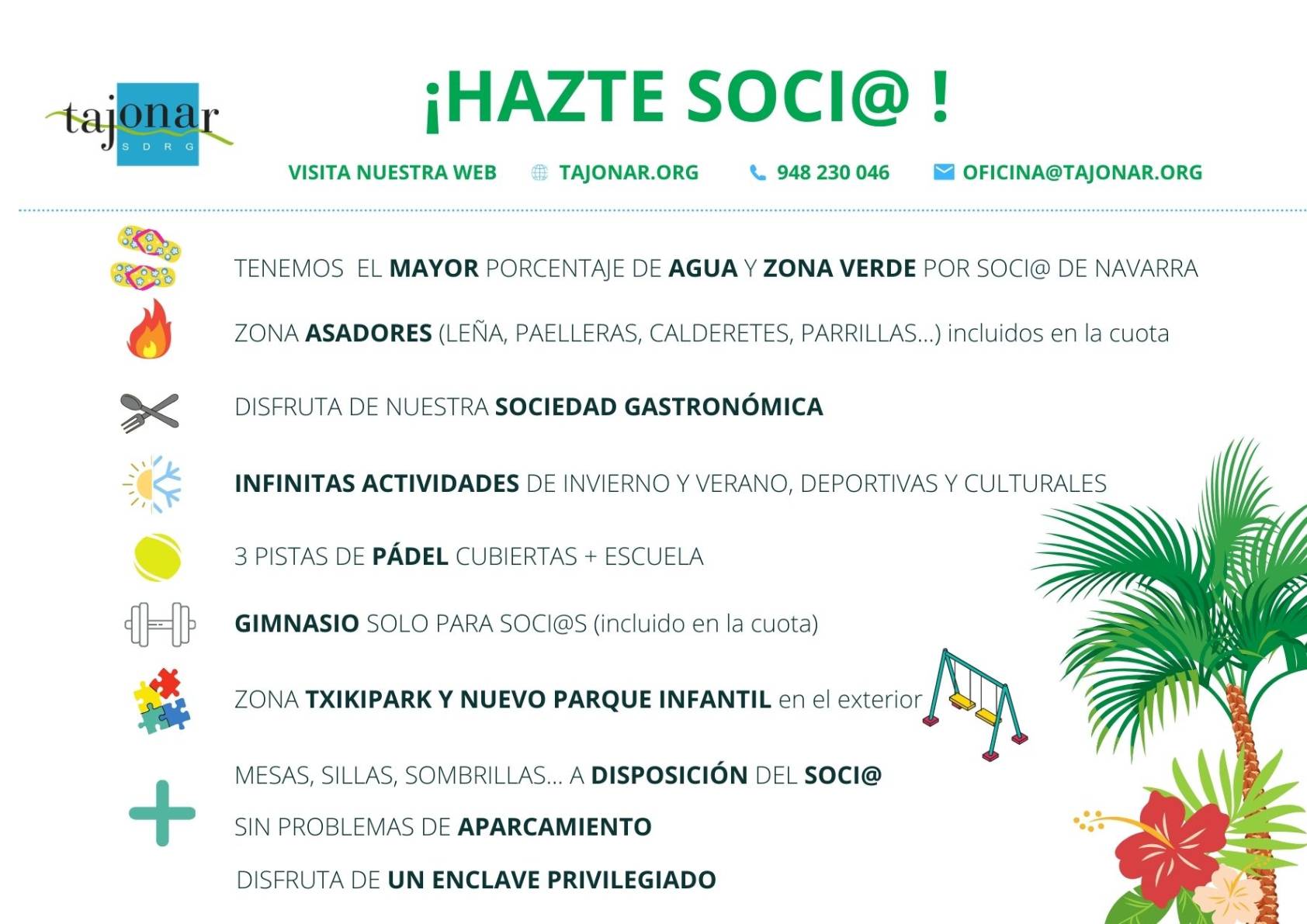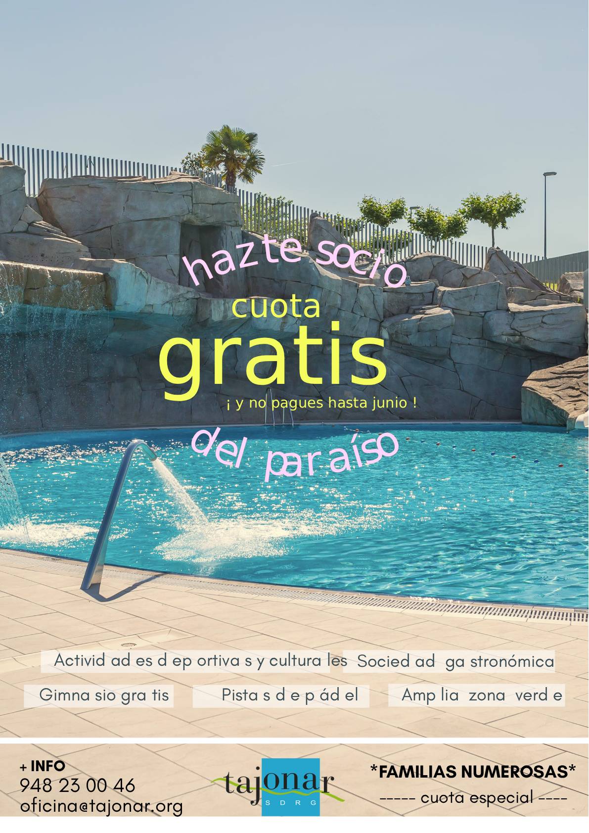 La sociedad deportiva, recreativa y gastronómica Tajonar lanza una promoción para hacerse socio con una ventaja directa: quienes se den de alta ahora no pagarán la cuota mensual hasta junio. La oferta es válida del 25 de marzo al 31 de mayo.
