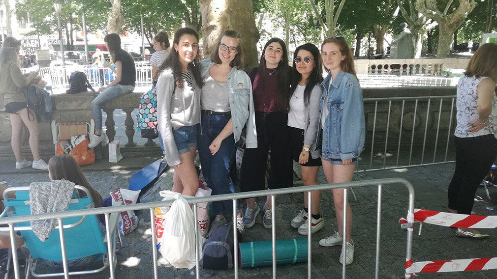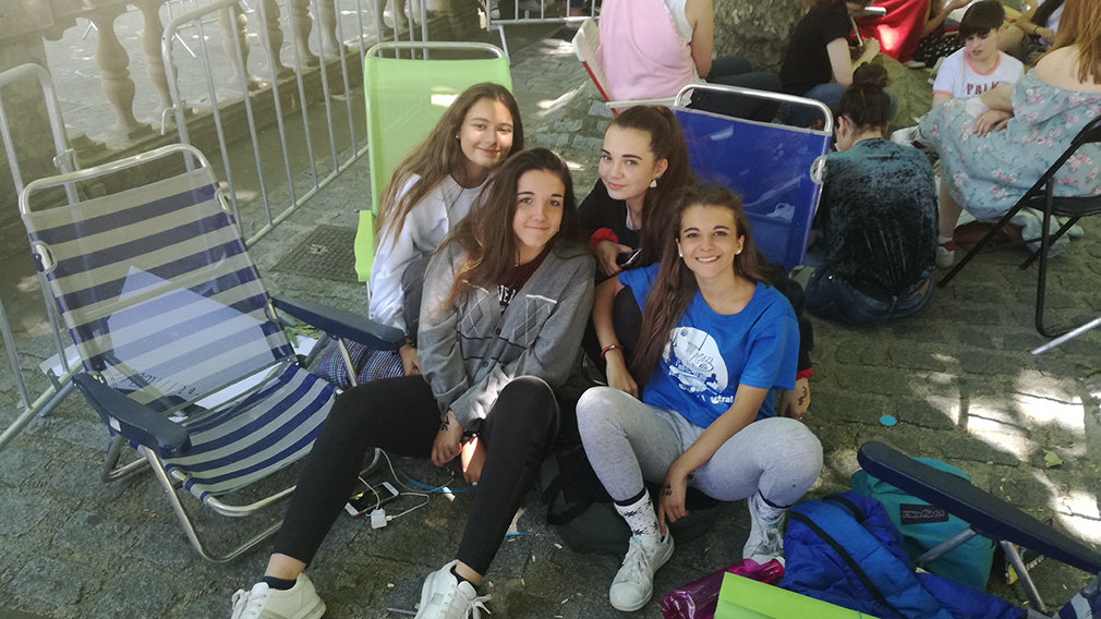 Un grupo de cinco chicas de entre 17 y 22 años, procedentes de Logroño, Badajoz, Madrid y Tudela, "ha aprovechado el concierto para reencontrarse tras conocerse en un campamento hace varios años" y han tomado sitio en la calle "desde las 22:00 de la noche del viernes, durmiendo más o menos una hora".