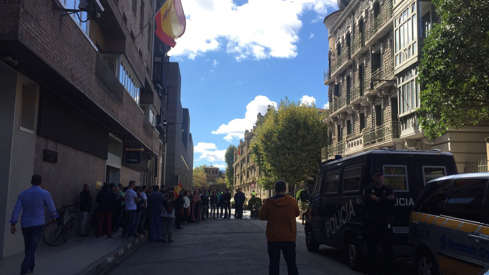 Decenas de agentes de la Policía Nacional se han manifestado este martes en Pamplona en defensa de sus compañeros que están desplegados en Cataluña para exigir al Ministerio de Interior que adopte medidas urgentes y efectivas para garantizar su seguridad ante los "ataques, acoso, persecución y señalamiento que los sectores independentistas radicales están llevando a cabo en diversas localidades".